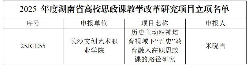 根据《关于申报 2025 年度湖南省高校思政课教学改革研究项目的通知》精神,我院米晓雪老师申报的课题成功立项。我院教师将积极参与教育科学研究,推动学校教育事业高质量发展。